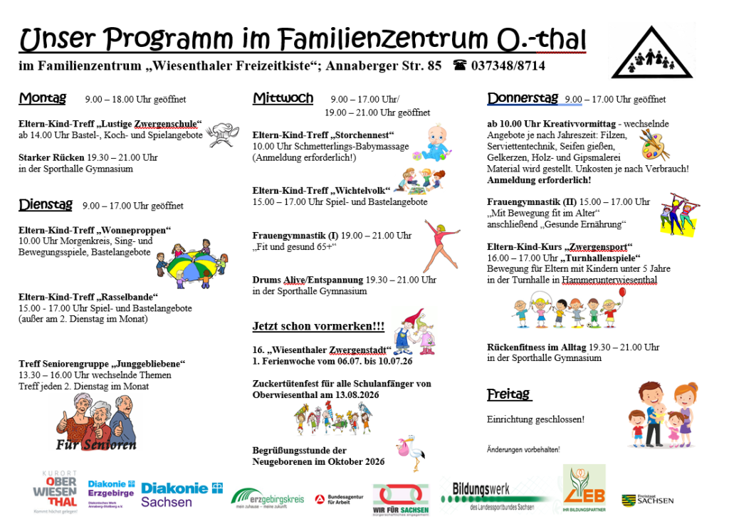 Seit 2004 nennen wir uns kurz „Familienzentrum Oberwiesenthal e.V.“, da unser Schwerpunkt immer die ganze „Familie“ mit all seinen Mitgliedern von 0 – 99 … sein wird.