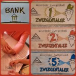 Ausgegeben werden die „Zwergentaler“ wiederum für die hergestellten Produkte oder Dienstleistungen wie z.B. eine Massage in der Wellnessoase, Kräuteressig, leckere Konfitüren, Waffeln, für die tägliche Zwergenzeitung, schöne Blumengestecke für die Eltern und Großeltern oder auch am Markttag für viele viele Dinge.